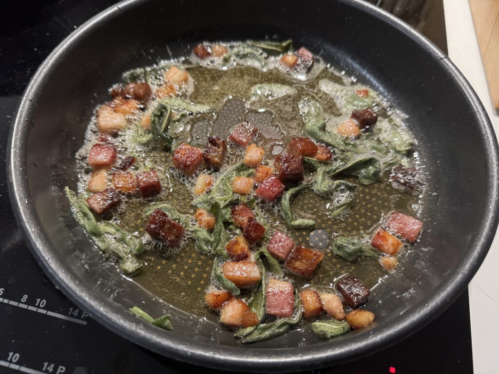 W międzyczasie kroimy boczek w kostkę i wraz z masłem oraz szałwią przekładamy na patelnię Na niewielkim ogniu smażymy całość, aby boczek zbrązowiał z każdej strony, a liście szałwii stały się kruche.