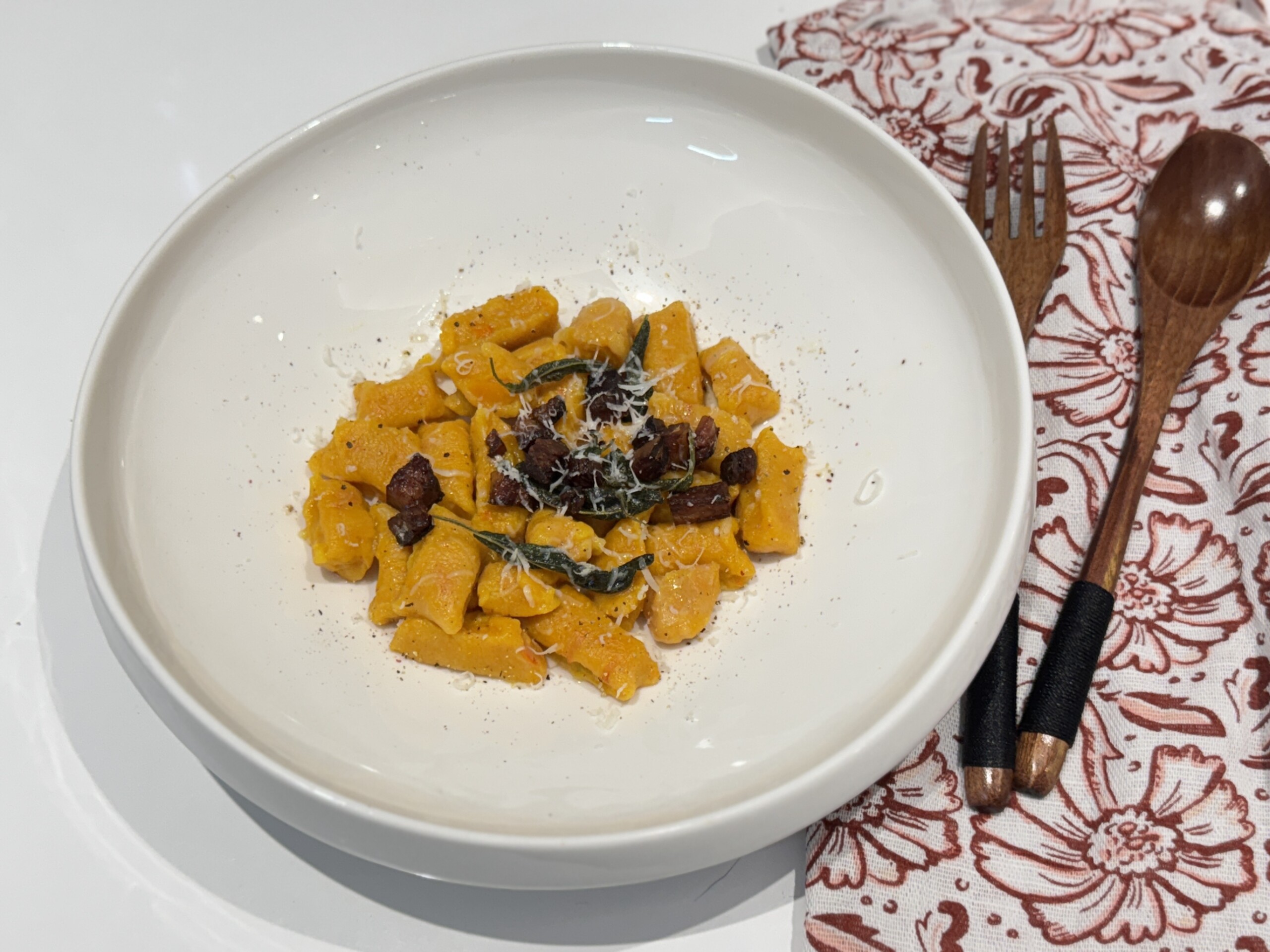 Idealny przepis na jesień. Wybór odpowiedniego rodzaju dyni ma tutaj kluczowe znaczenie, dlatego kupcie dynię hokkaido. Z jednej dynii (ok. 700-800 g) przygotujecie 4 porcje gnocchi.
