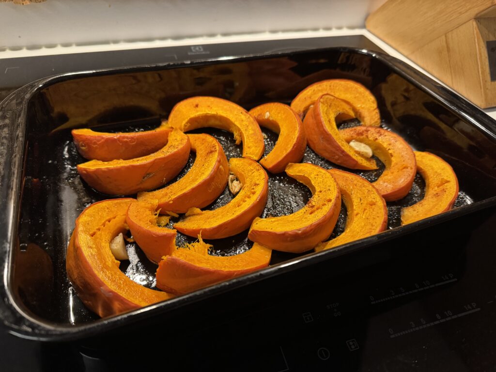 Dynię wraz ze skórką kroimy na pół i łyżką wydrążamy nasiona. Następnie kroimy ją na kawałki o szerokości 3-4 cm. Brytfankę polewamy oliwą, układamy w niej kawałki dynii oraz dwa ząbki czosnku, posypujemy solą, pieprzem i odrobiną wędzonej papryki. Wstawiany do piekarnika rozgrzanego do 180 stopni Celsjusza na 20-25 minut. Dynia będzie gotowa, gdy bez problemu wchodzi w nią widelec.