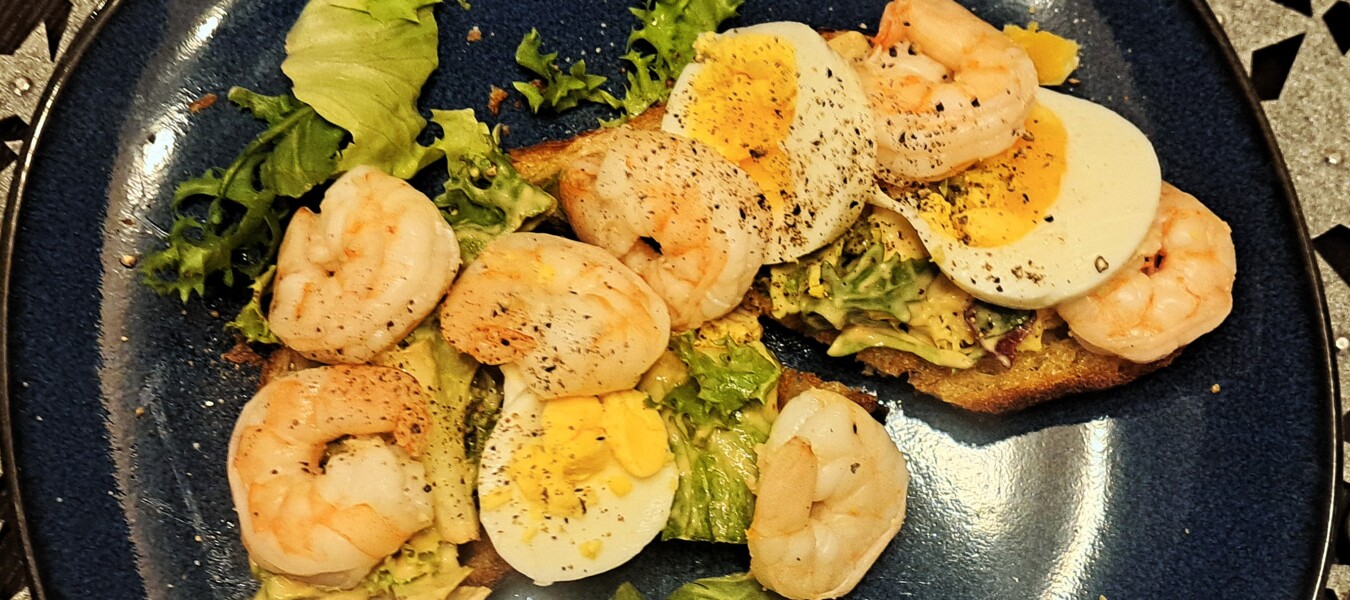 Grzanka z krewetkami i jajkiem na twardo