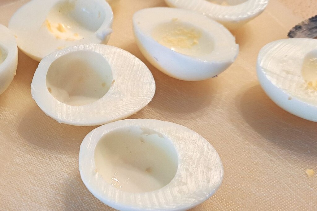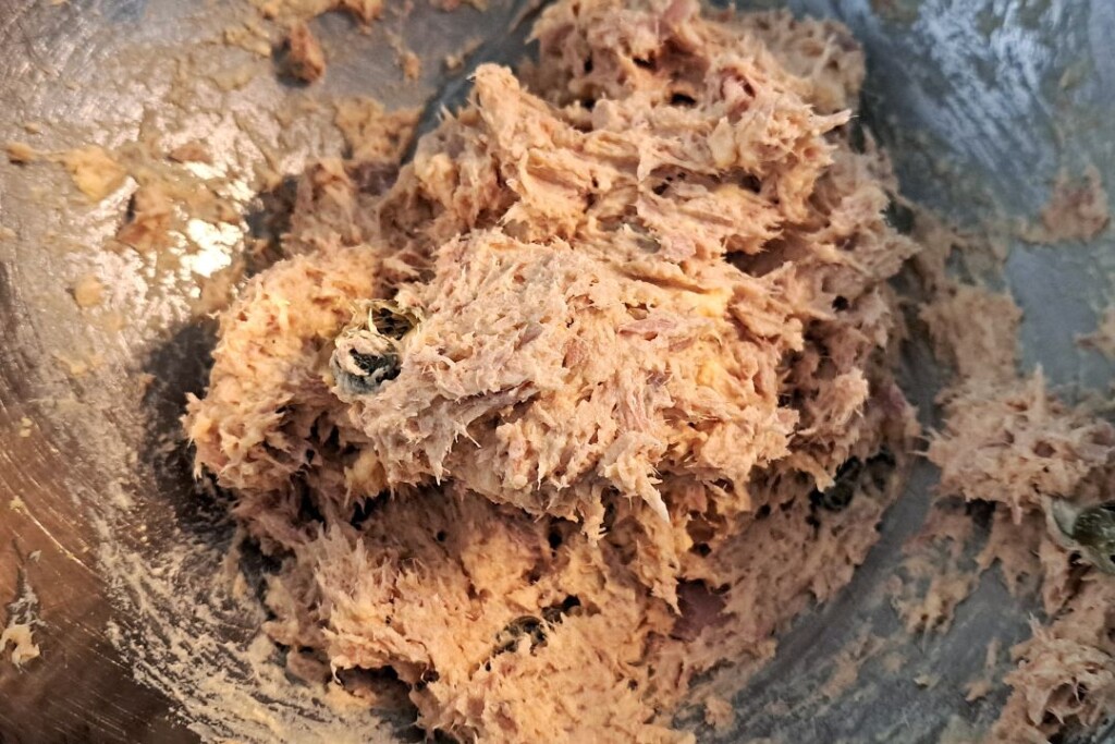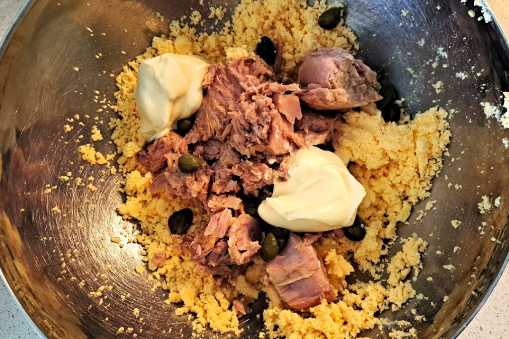 Jaja przekrawamy wzdłuż na pół i wyciągamy delikatnie żółtka z białek i przekładamy je do oddzielnej miski. Widelcem rozgniatamy je na w miarę jednolitą masę. Dodajemy tuńczyka, kapary i łyżkę majonezu (wedle uznania). Doprawiamy solą i pieprzem. Pracujemy dalej widelcem nad osiągnięciem w miarę homogenicznego nadzienia.
