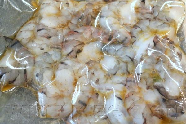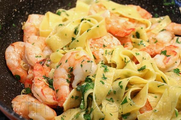 Surowe krewetki tygrysie obieramy z pancerzy i wyjmujemy nitkę przewodu pokarmowego. Gdy będziemy je przygotowywać sous-vide, to należy je obtoczyć w oliwie z oliwek, doprawić solą i pieprzem oraz zamknąć vaccum w plastikowej torebce tak, aby nie nachodziły na siebie. Trzymamy je w kąpieli wodnej o temperaturze 57°C przez 30 minut. Gdy przygotowujemy je tradycyjnie, to wrzucamy do wrzątku z plasterkami cytryny i gotujemy 2-3 minuty lub smażymy 2 minuty aż staną się różowe w trakcie przygotowywania sosu. Na patelni na maśle z oliwą z oliwek przesmażamy chwilkę przeciśnięty przez praskę czosnek (uwaga, aby go nie spalić). W przypadku, gdy chcemy krewetki usmażyć, dodajemy surowe. Smażymy 2 minuty lub dodajemy ugotowane (czy to sosu-vide czy w garnku) i tylko obtaczamy w tłuszczu na patelni kilkadziesiąt sekund. Doprawiamy solą i pieprzem. Zdejmujemy patelnię ze źródła ciepła. Dodajemy posiekaną natkę pietruszki, sok z cytryny, skórkę otartą z cytryny i jeśli mamy ochotę – trochę ostrego chilli (w dowolnej formie). Dodajemy ugotowany al’dente pappardelle lub tagliatelle. Mieszamy i podajemy.