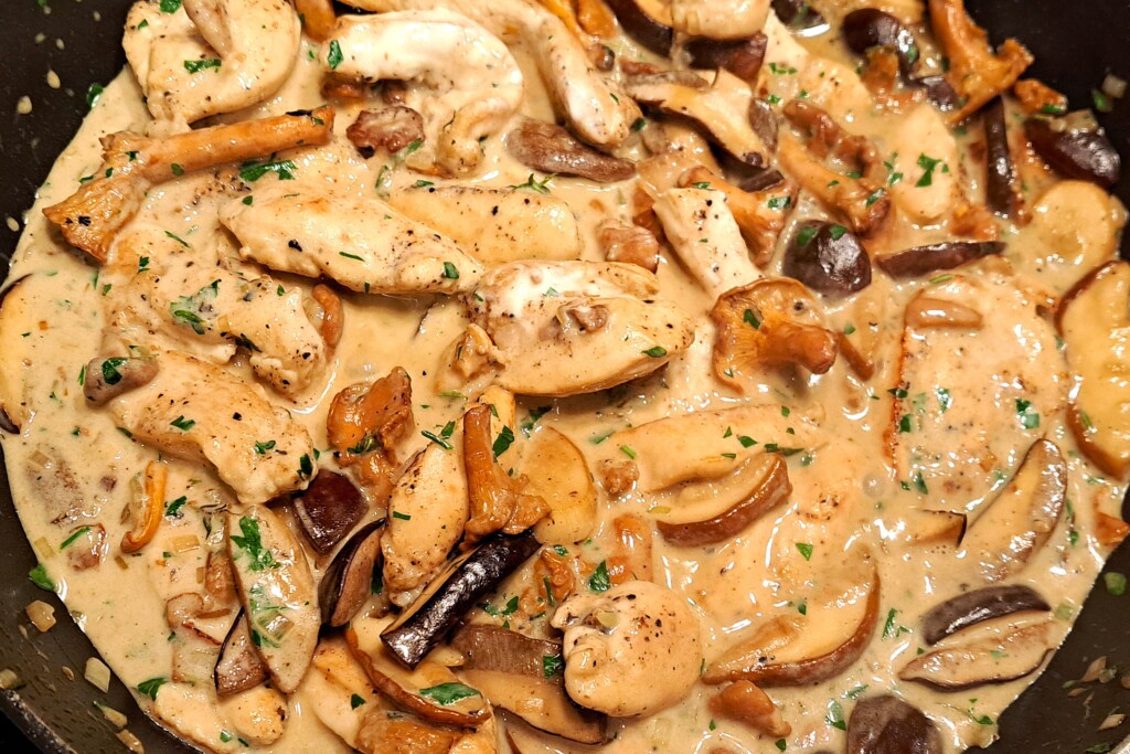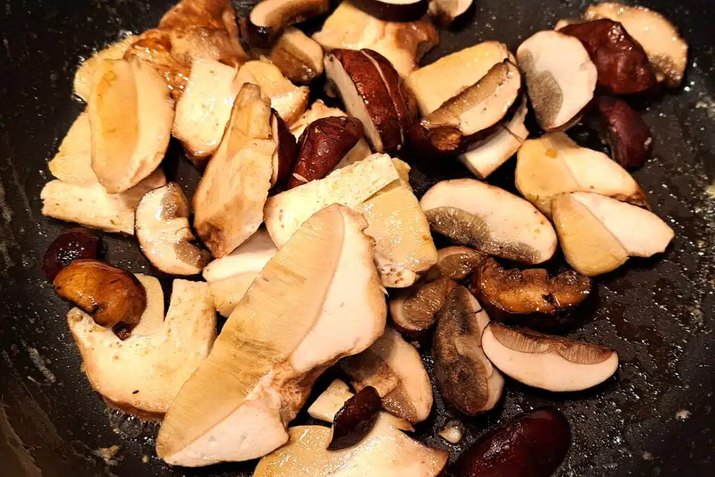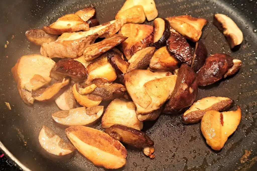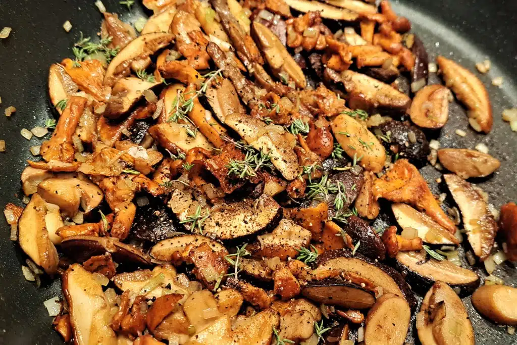 Do tego dania możecie użyć swoich ulubionych leśnych grzybów, bądź też takich które znajdziecie na grzybobraniu albo kupicie na bazarze. Najlepiej sprawdzą się – podgrzybki, borowiki, kurki, koźlaki. Jakby było za mało możecie swobodnie uzupełnić stawkę pieczarkami lub portobello.