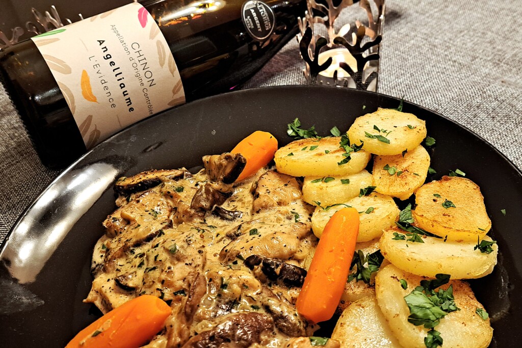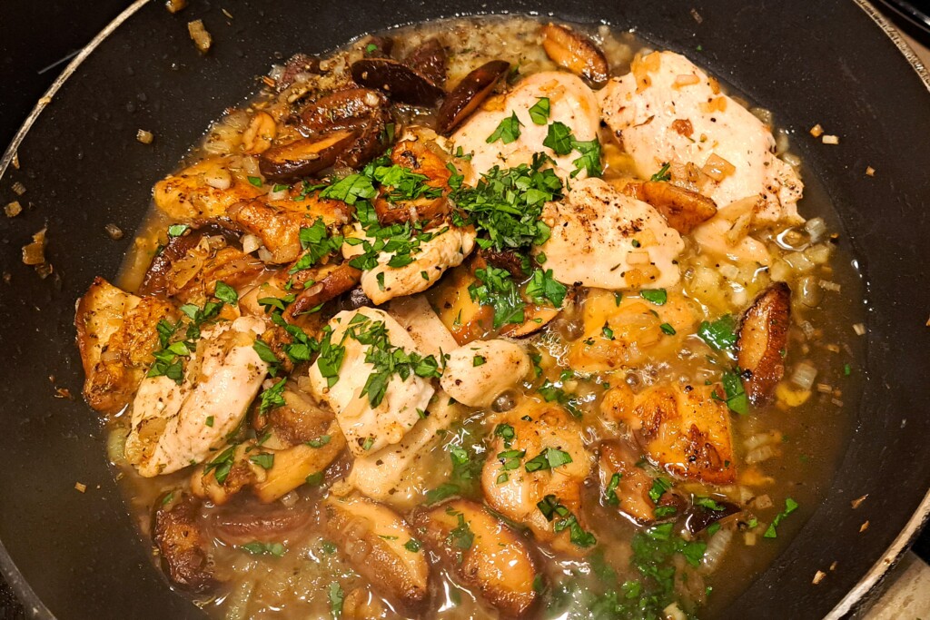 Wkładamy kurczaka z powrotem na patelnię, dodajemy listki tymianku, natkę pietruszki i zalewamy bulionem. Zagotowujemy. Dodajemy śmietanę rozprowadzamy i redukujemy chwilkę. W tym czasie kurczak się znowu zagrzeje w sosie. Podajemy z ziemniakami w ulubionej postaci i z marchewką/brokułem/kalafiorem.