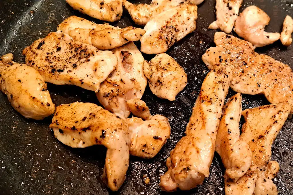 Pierś kurczaka kroimy w plasterki i doprawiamy solą i pieprzem. Na patelni rozgrzewamy masło i smażymy kurczaka dosłownie 3 minuty aż będzie złoty/rumianych z każdej strony. Zdejmujemy mięso z patelni i odkładamy do miski lub na deskę.