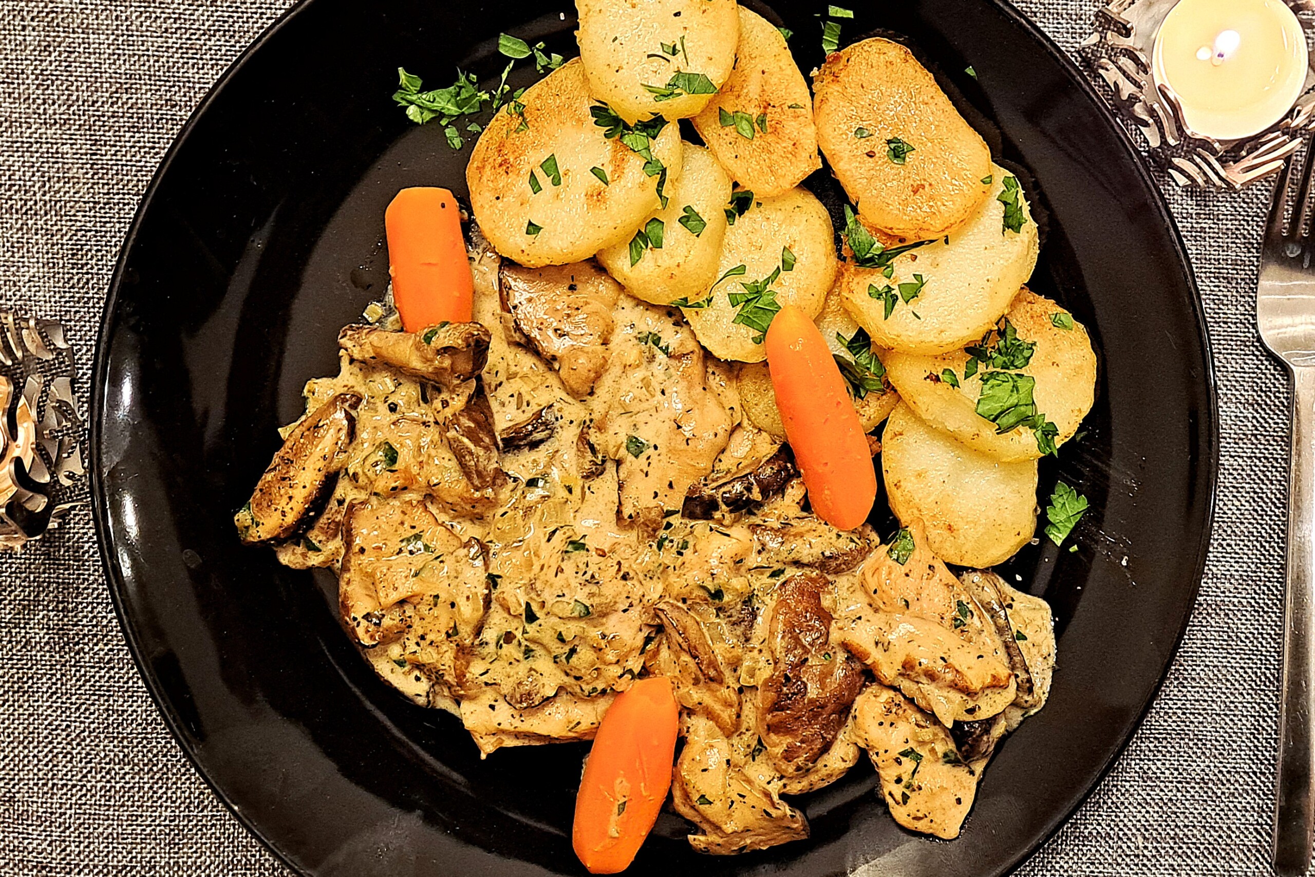 Wkładamy kurczaka z powrotem na patelnię, dodajemy listki tymianku, natkę pietruszki i zalewamy bulionem. Zagotowujemy. Dodajemy śmietanę rozprowadzamy i redukujemy chwilkę. W tym czasie kurczak się znowu zagrzeje w sosie. Podajemy z ziemniakami w ulubionej postaci i z marchewką/brokułem/kalafiorem.