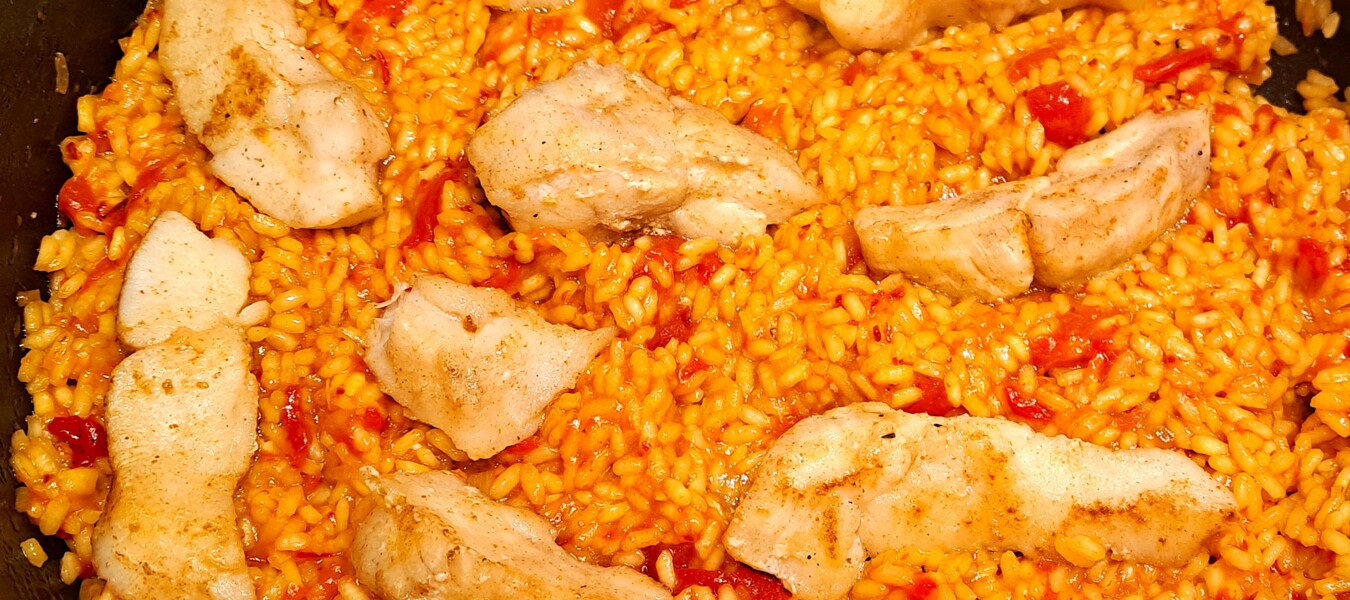 Szafranowy ryż z żabnicą i pieczoną papryką