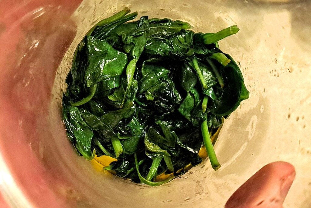 Na patelni, na oliwie z oliwek, podsmażamy rozgnieciony ząbek czosnku razem z kawałkiem (lub dwoma uciętymi z dużego strączka) papryczki chili. Gdy czosnek będzie rumiany wyrzucamy go, a papryczkę wyjmujemy i zachowujemy. Na tę samą patelnię wkładamy liście świeżego szpinaku i podsmażamy, mieszając aż będzie miękki. Kilka listków zachowujemy a resztę przekładamy do blendera. Doprawiamy trochę sola i pieprzem, dolewamy oliwę i miksujemy na gładką masę.