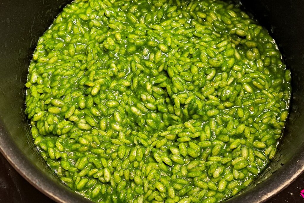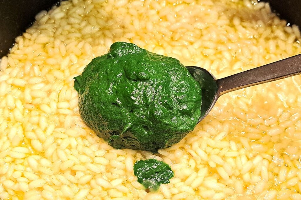W rondlu na oliwie z oliwek smażymy chwilkę ryż i zaczynamy zalewać go bulionem warzywnym partiami i gotujemy na wolnym ogniu. Warto mieć bulion pod ręką w podgrzewanym garnku aby wlewając kolejną chochlę nie zmniejszać temperatury ryżu. Mniej więcej po 10 minutach (w połowie gotowania) dodajemy masę szpinakową. Kończymy gotowanie ryżu dolewając kolejną partię bulionu kiedy jest al dente a struktura dania lekko płynna. Doprawiamy najlepszą oliwą z oliwek extra vergine, świeżo mielonym pieprzem i Parmezanem/Grana Padano i dokładnie mieszamy.
