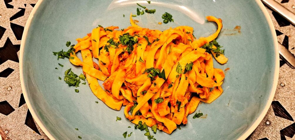 Makaron z sosem pomidorowym, tuńczykiem i świeżym imbirem
