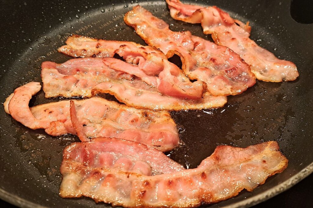 Wykładamy danie na talerze. Dekorujemy plasterkami boczku i listkami rukoli.
