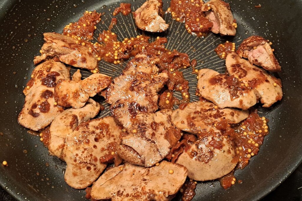 Wątróbki królicze z boczkiem i musztardowym sosem