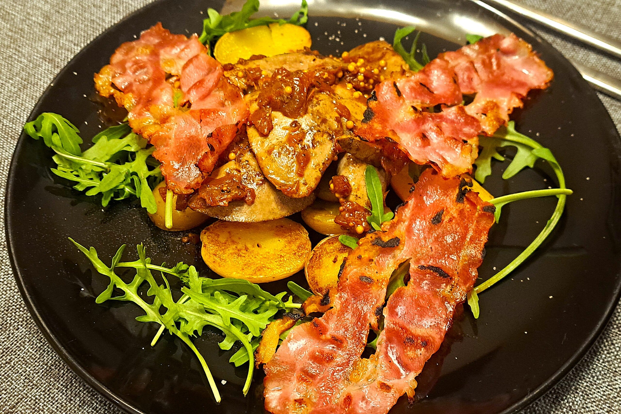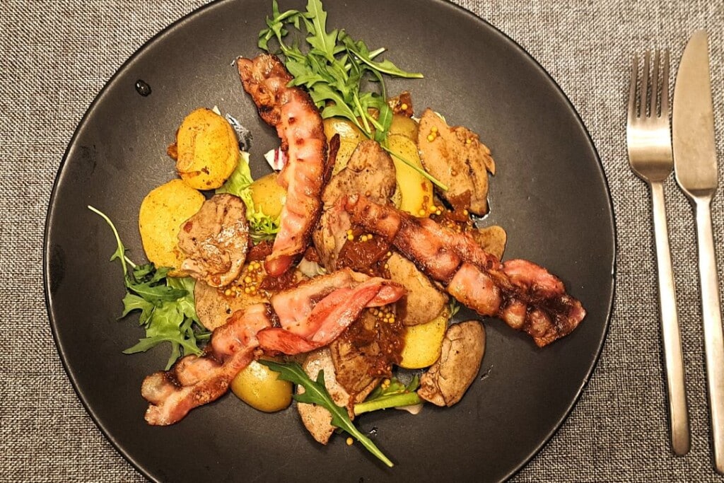 Jeśli ktoś lubi wątróbkę drobiową to ta z królika jest kolejnym stopniem wtajemniczenia. Smażony boczek doda chrupkości a musztarda ziarnista i ocet kwaskowej pikantności. Dobra rzecz!