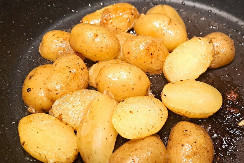Wątroby królicze czyścimy, obieramy z błon i wykrawamy tłuszcz. Młode ziemniaki (nie w sezonie mogą być też greckie czy cypryjskie) lub francuskie Lambert – myjemy i gotujemy. Odcedzamy jak będą miękkie i odkładamy na bok. Gdy trochę wystygną przekrawamy je na pół.