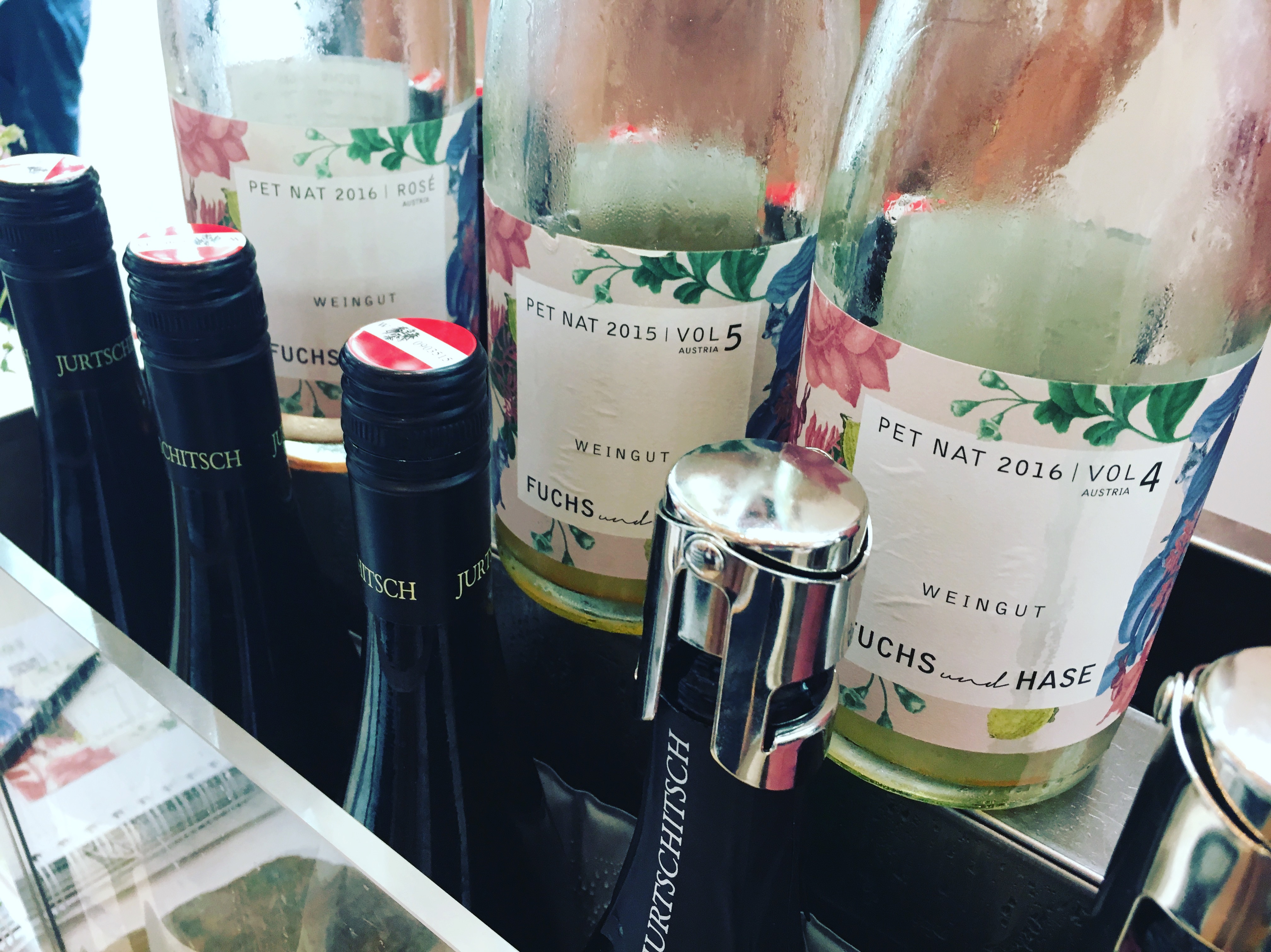 Wspomniane zaś Pet-Naty to ciekawa historia, która jest wspólnym projektem Weingut Jurtschitsch i Weingut Arndorfer butelkowanych pod marką Weingut Fuchs und Hase. Powstaje ich kilka różnych wersji, różnią się między sobą użytymi odmianami i długością macerowania wytłoczonego soku na skórkach. Przypomnijmy tylko, że ten sposób produkcji win musujących polega na przeprowadzeniu wtórnej fermentacji w butelkach (podobnie jak przy metodzie klasycznej), ale pozostały po rozpadzie drożdży osad nie jest z nich usuwany.