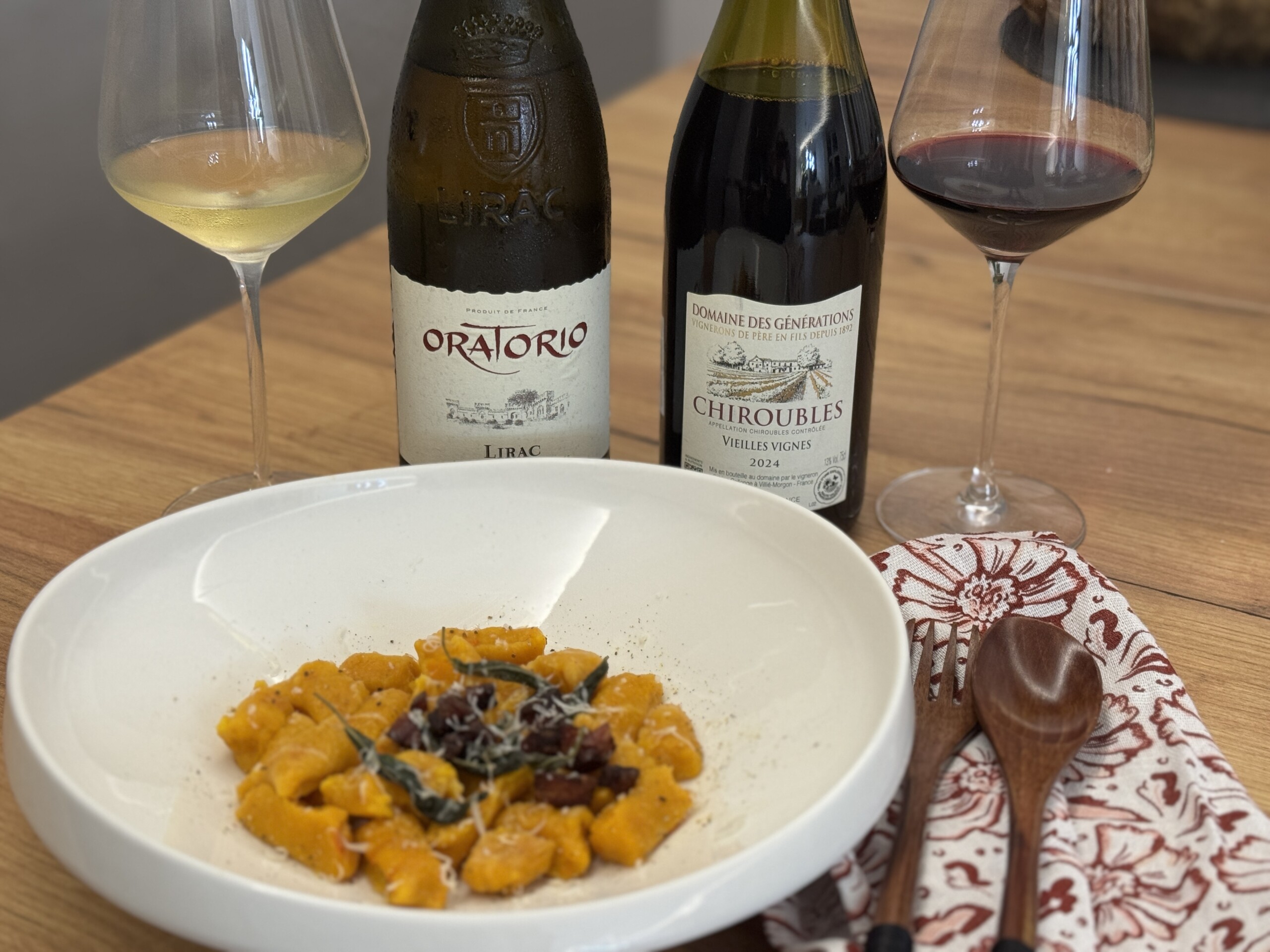 Miałem zagwozdkę, jakie wino wybrać do dania. Mieszało się w nim sporo smaków i różnych tekstur, więc postanowiłem otworzyć dwie butelki i sprawdzić w boju, które z nich wypadnie lepiej. Postawiłem na czerwień z jednego z cru Beaujolais (bo pamiętałem, że w Bergamo piliśmy do gnocchi właśnie takie lekko zbudowane czerwone wino i świetnie pasowało), ale chciałem też zobaczyć, czy pasować będzie mocniej zbudowana, ale mało aromatyczna biel.