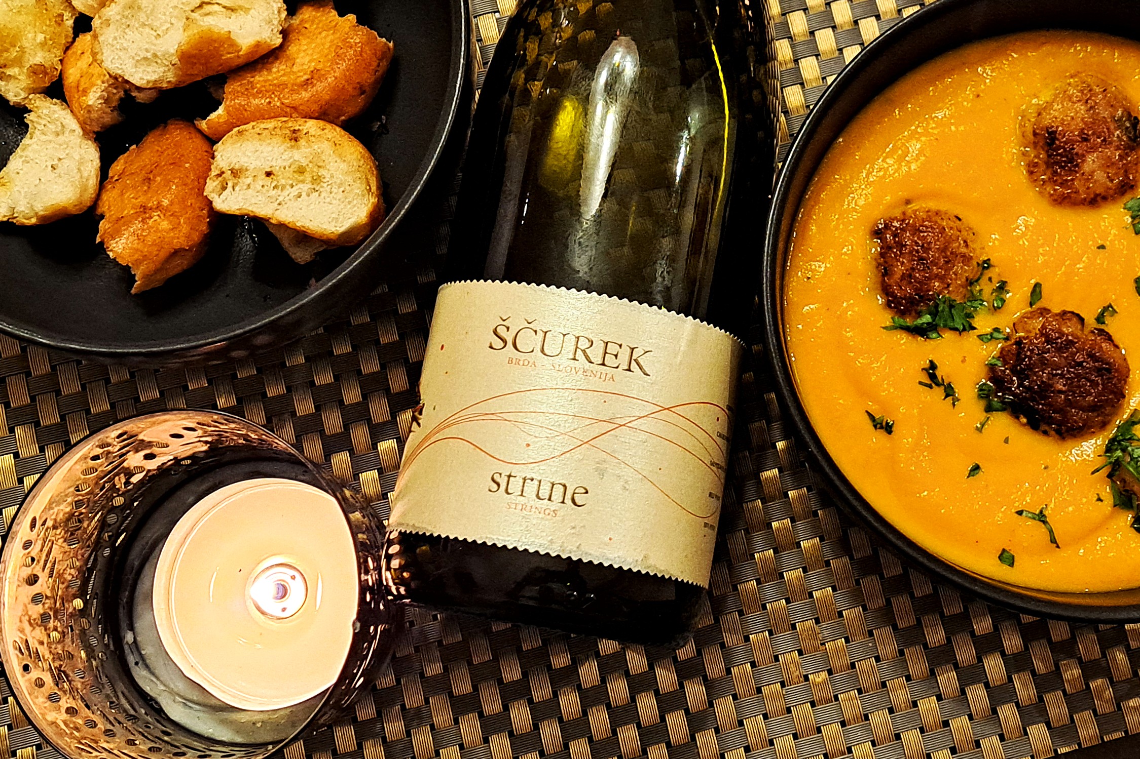 Mocno się zastanawiałem jakie wino wybrać. Oczywiście pierwszy etap selekcji to umiarkowana biel bez beczki. Złapać zarazem pikantność, słodycz marchewki i gęstość rybnego klopsika to niełatwa sprawa. Moje myśli krążyły wokół jakiegoś Mâcon (ale ten wybór wydał mi potem się zbyt kwasowy i szczupły) czy też może grauburgundera z cieplejszego Palatynatu (tego nie miałem w piwniczce i nie miałem jak kupić) – w końcu olśniło mnie. Otworzyłem znowu Słowenię. Eklektyczny blend pięciu szczepów z Brdy (rebuli, chardonnay, friulano, pinot bianco i pinot grigio) który maceruje się 4 godziny, fermentuje w stali i tam dojrzewa 5 miesięcy.